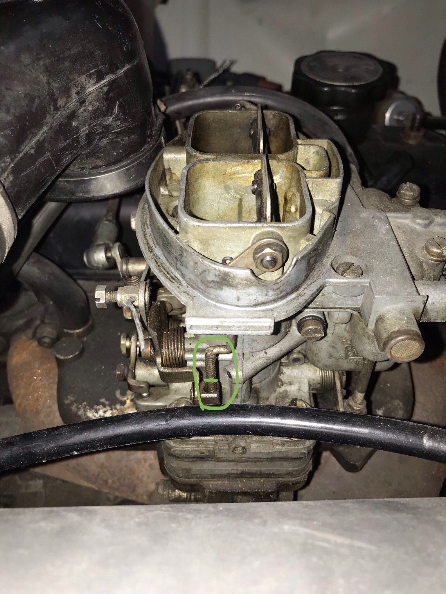 También he visto que al soltar el choke la palometa del aire no gira porque se queda arriba, no se si el torinillo rodeado en verde tiene que tener un tope o algo que la devuelva a su sitio cuando suelte el choke.