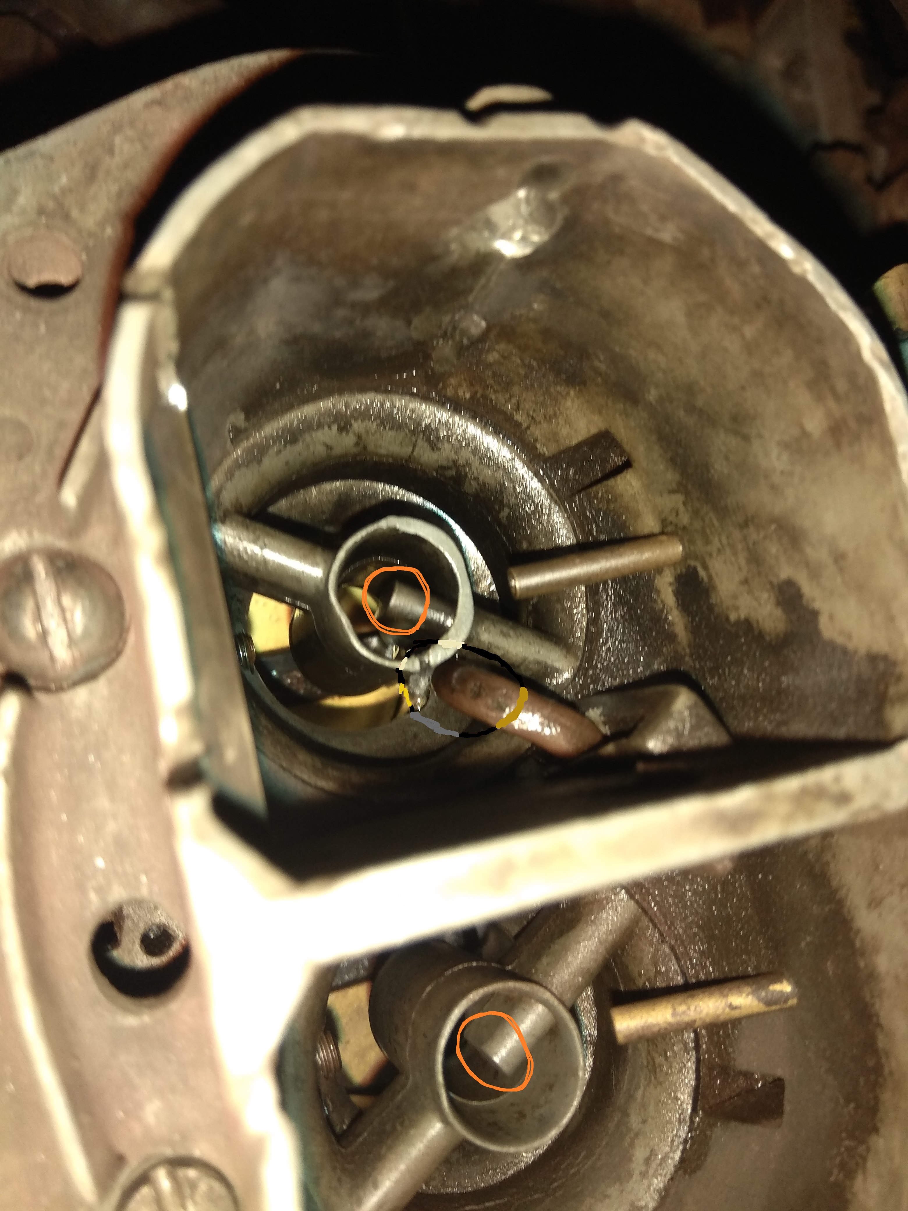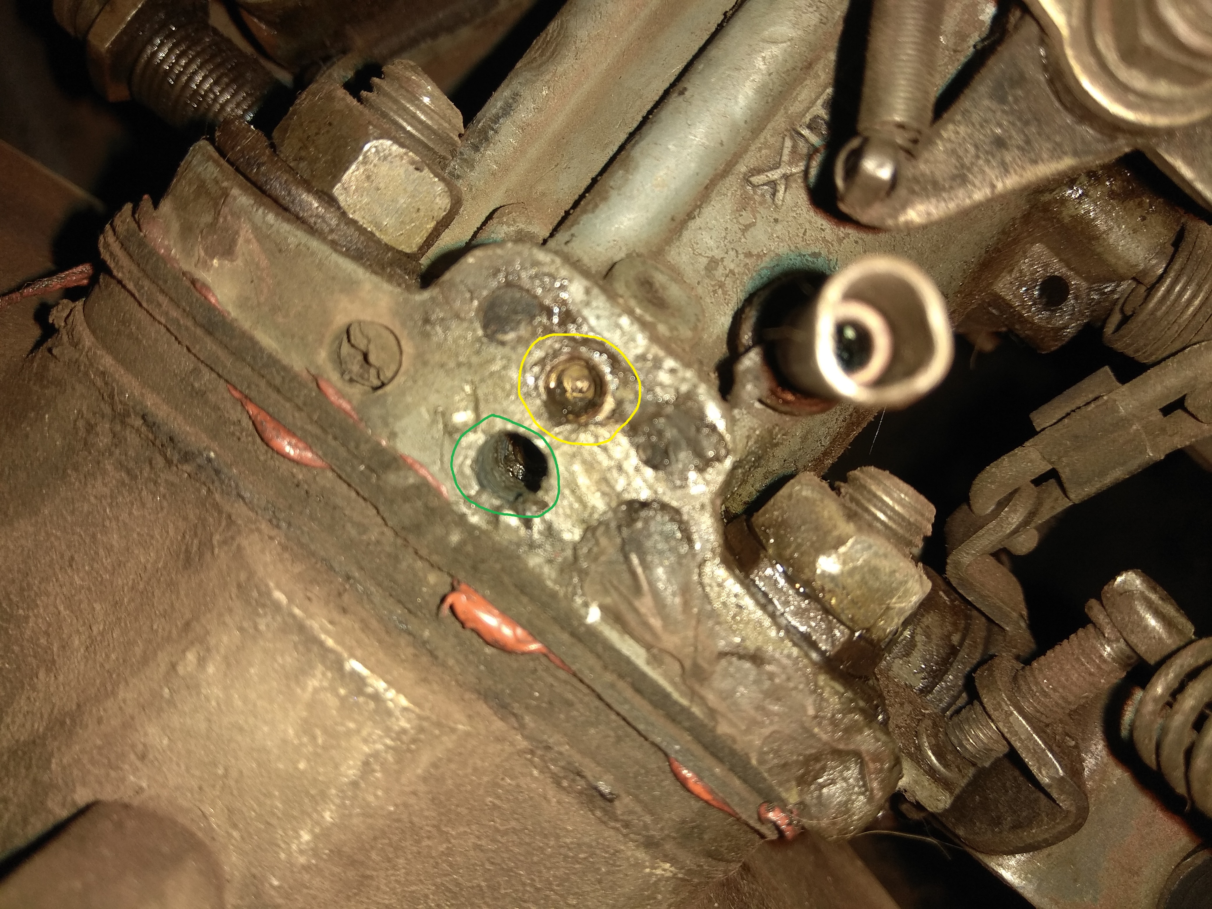 5 - Marcado en amarillo tenemos un hueco donde, para mi, iría otro tornillo. Si es afirmativo, ¿Qué tornillo iría? ¿Llevaría numeración? ¿Cuál sería su función? (subo imagen del hueco lo mas cerca que pude enfocar)