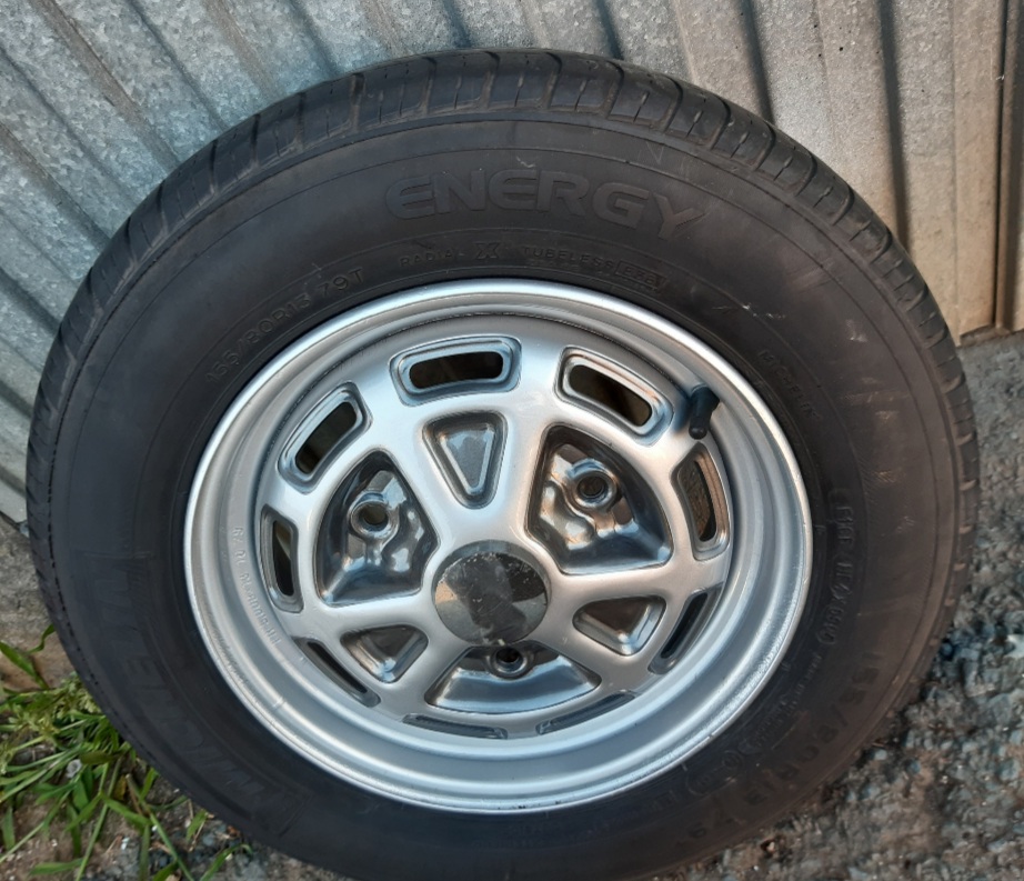 Esta es la quinta del juego que tenía de repuesto, va montada con un neumático Michelin Energy en medida 155-80/13 , lleva tapa cromada original y se chorreó con arena, imprimación epoxy, pintura bitono y barniz. Desde eso sólo estuvo en el hueco de repuesto, nunca la llegué a montar.