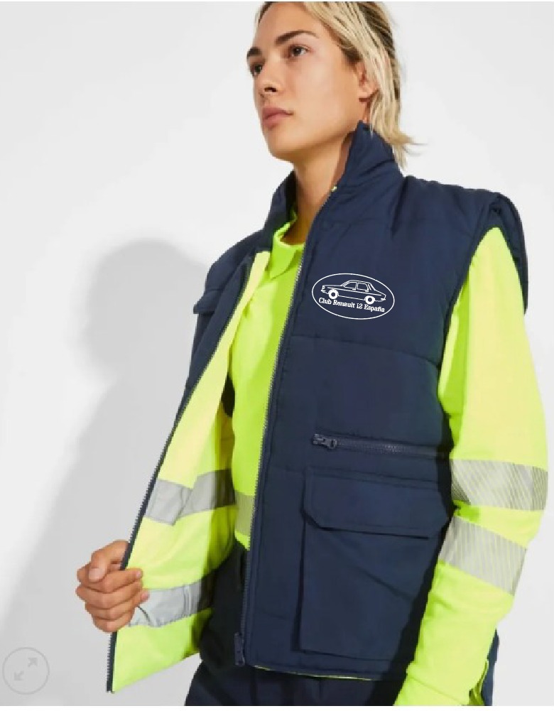 Chaleco reversible multibolsillos y alta visibilidad, con cuello alto.