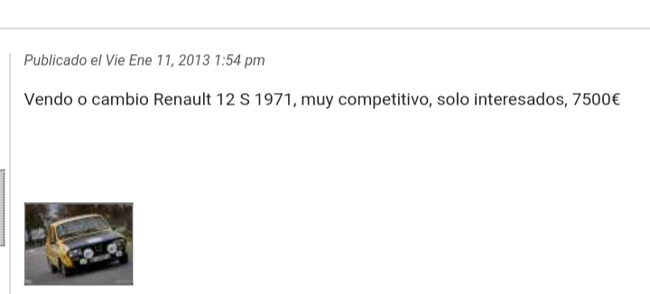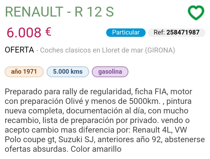 Ahi esta la diferencia, quien quiera un coche preparado para rallyes clásicos, puede probar a comprarlo, ahora bien, debe ser quien sea aficionado a los rallyes clásicos y le guste el 12, porque si le gusta mucho, MUCHO el Renault 12, hay Gordinis, que haberlos haylos.