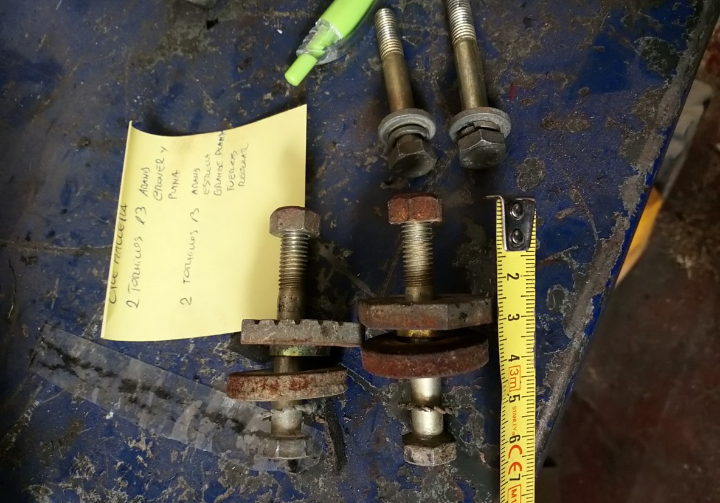 ,así que empecé a dar vueltas al coco.De primeras me presente en una ferretería con mis tornillos y tuercas en un cubo a ver si había posibilidad de comprar las mismas medidas y nuevos zincados o de algún otro tratamiento.Las posibilidades no fueron nulas, pero gran parte de los tornillos erán o más largos o más cortos y no era ningún plan de ponerme a recortar.