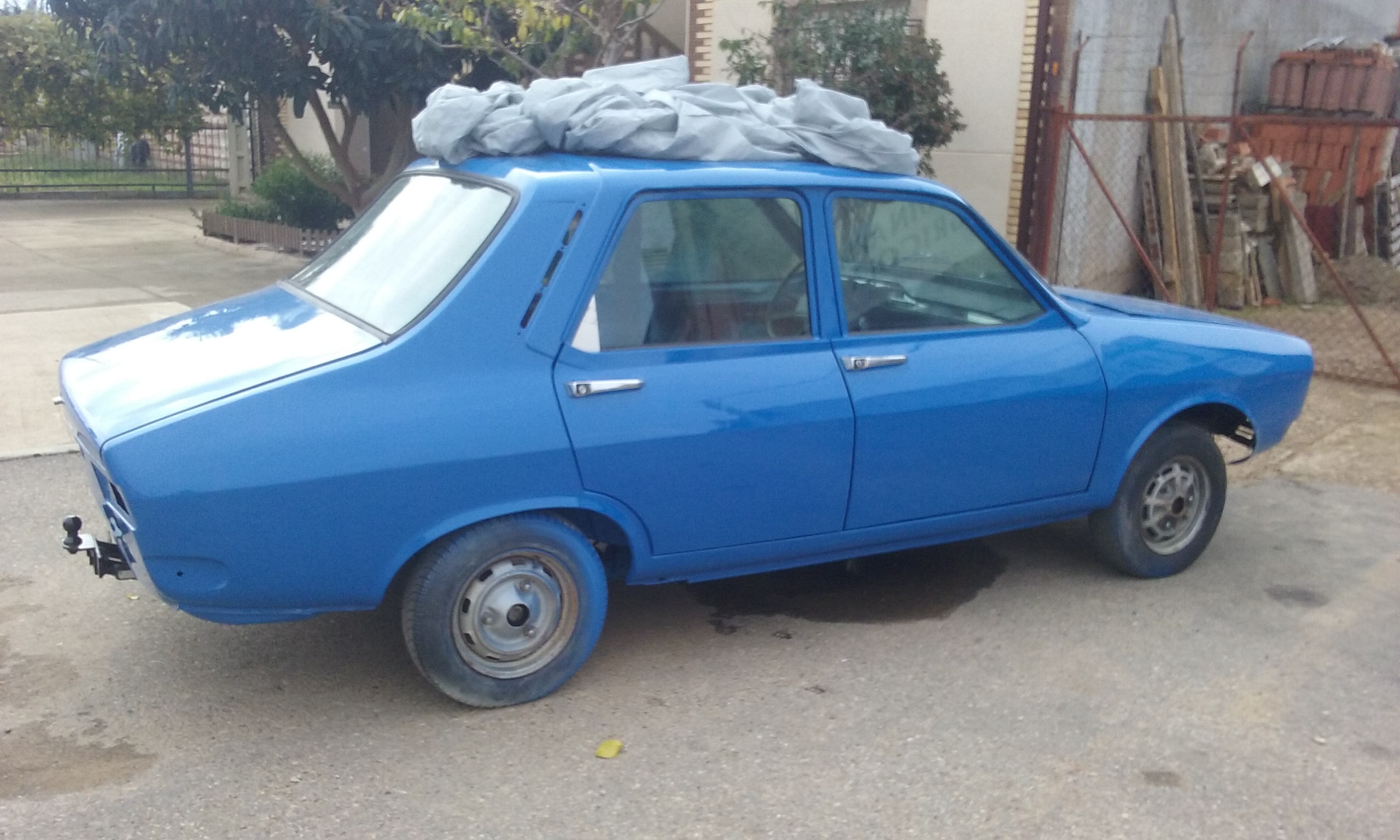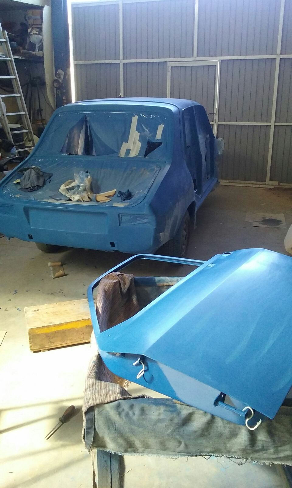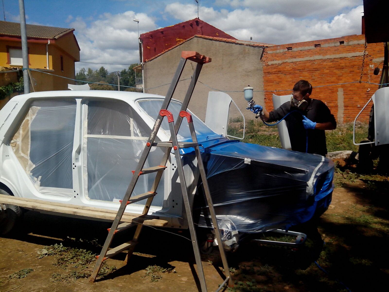 Una vez pintados los interiores, lo siguiente que hice fue pintar el exterior, con todas las piezas de chapa desmontadas, puertas, aletas y capós. Comentando el tema con varios conocidos pintores, me animaron a que lo pintase yo mismo, ya de haber realizado yo todo el trabajo me decían: "o te cuelgas tu todas las medallas o si queda mal ya sabes que no tienes ni idea de pintar" y la verdad que compresor y una buena pistola tenia pero, pintarlo yo eran palabras mayores, sin cabina de pintura y sin experiencia. Me recomendaron pintarlo en el exterior al carecer de cabina de pintura, el suelo bien mojado, un día con temperatura adecuada y sin aire... Lo pinte en bicapa, con la base de color primero, una vez seca lijada con lija al agua y luego el barniz para darle brillo. El proceso se escribe rápido pero anda que no llevo tiempo...
