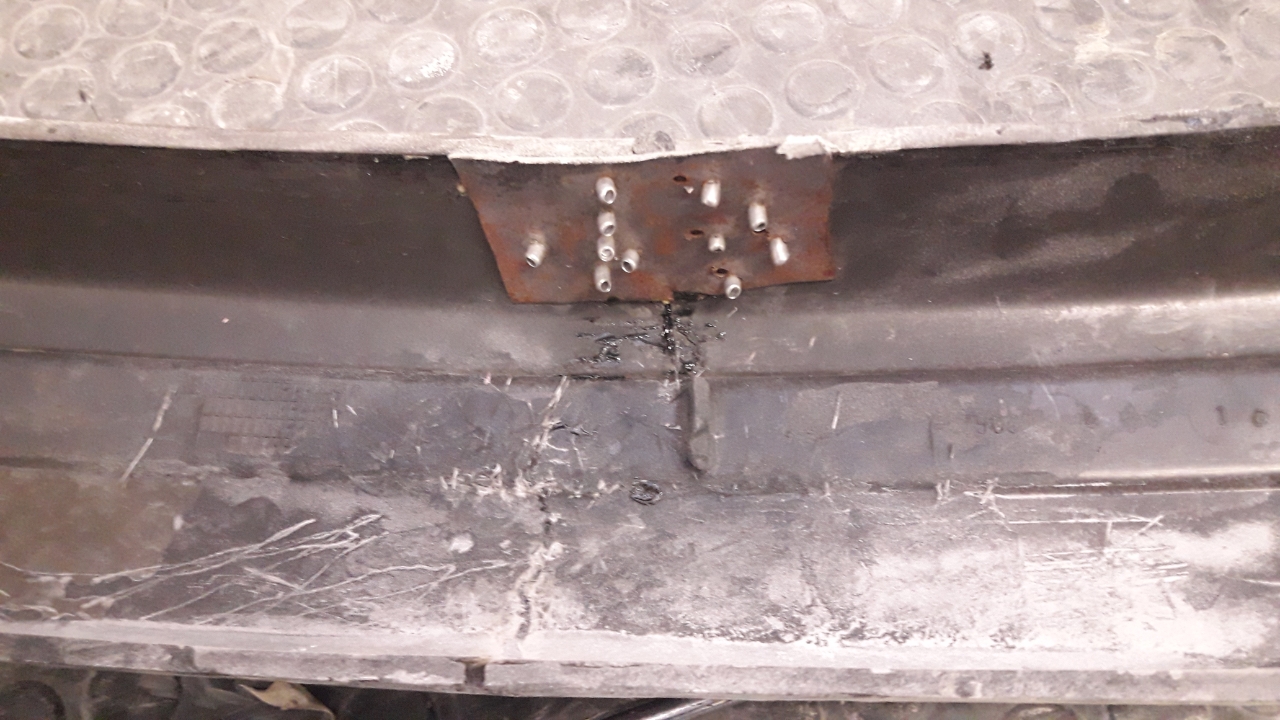 Aproveche la chapa que le metieron con mil remaches(no se molestaron ni en cortar el trozo que sobresalía de la defensa), para no debilitar mas la zona y que no se me moviera demasiado de su posición a la hora de meterle el otro refuerzo de chapa con la resina y fibra.