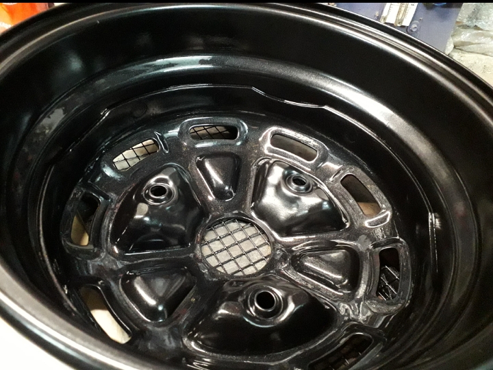 El proceso es: chorreado, imprimación epoxi, lijado completo interior/exterior, pintado interior con pintura bicapa negra metalizada, pintado exterior con el beige oscuro, enmascarado, lijado exterior para eliminar residuos del beige en la zona a pintar de gris plata, pintado de gris plata meralizado, desenmascarado y por ultimo barnizado total de la llanta interior/exterior.
