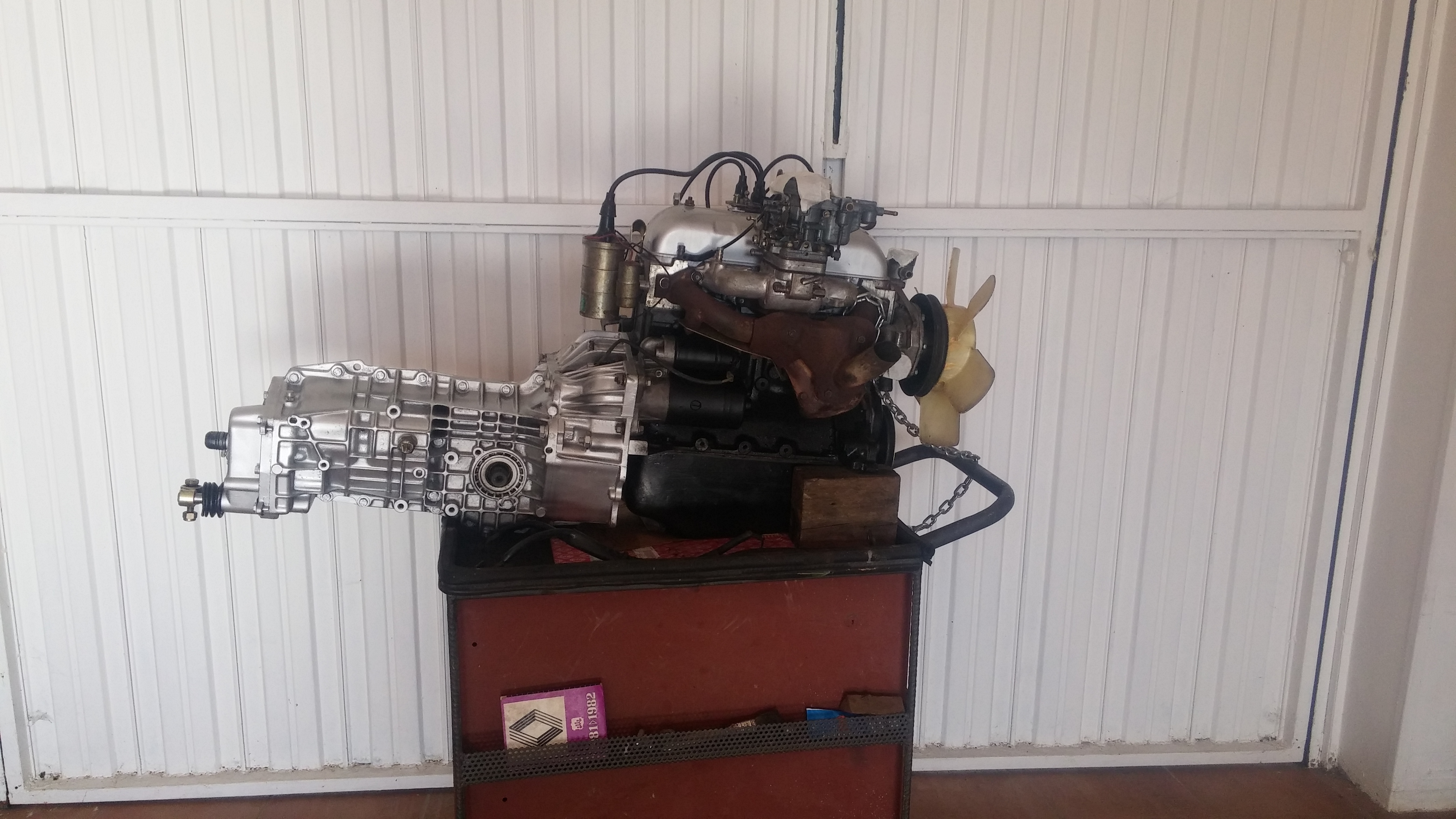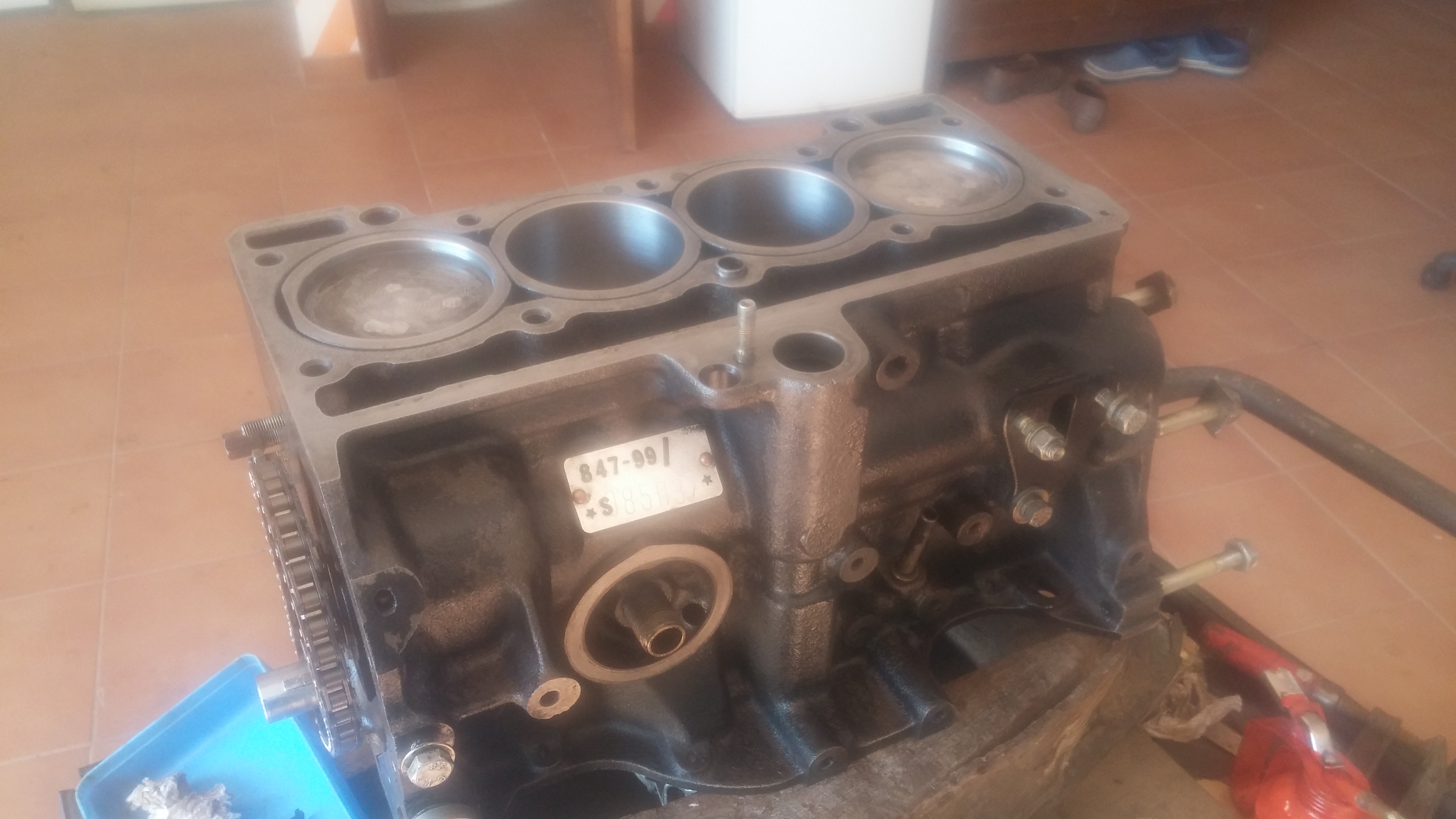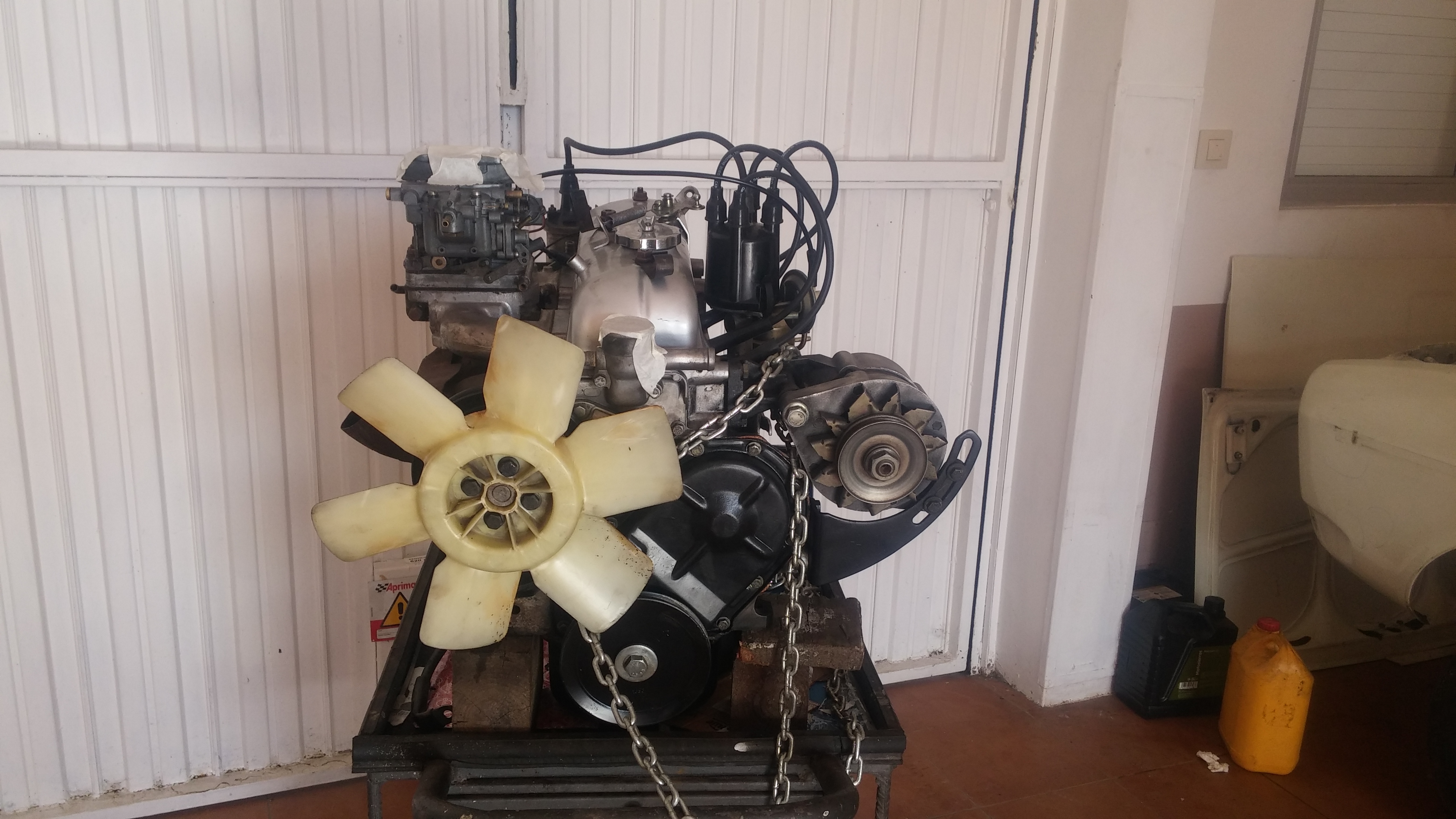 Empezamos sacando el conjunto motor-caja de cambios. Seguidamente le dimos un buen repaso, se sustituyeron juntas, retenes, bujías, platinos, embrague, kit de distribución... La cadena de distribución estaba un pelin estirada y no coincidían las marcas de calado debidamente por eso decidi sustituirla Disculpad la calidad de las fotos, como dije perdí un montón de fotos debido a un problema con el disco duro del ordenador estas son las únicas que me quedan en el móvil.