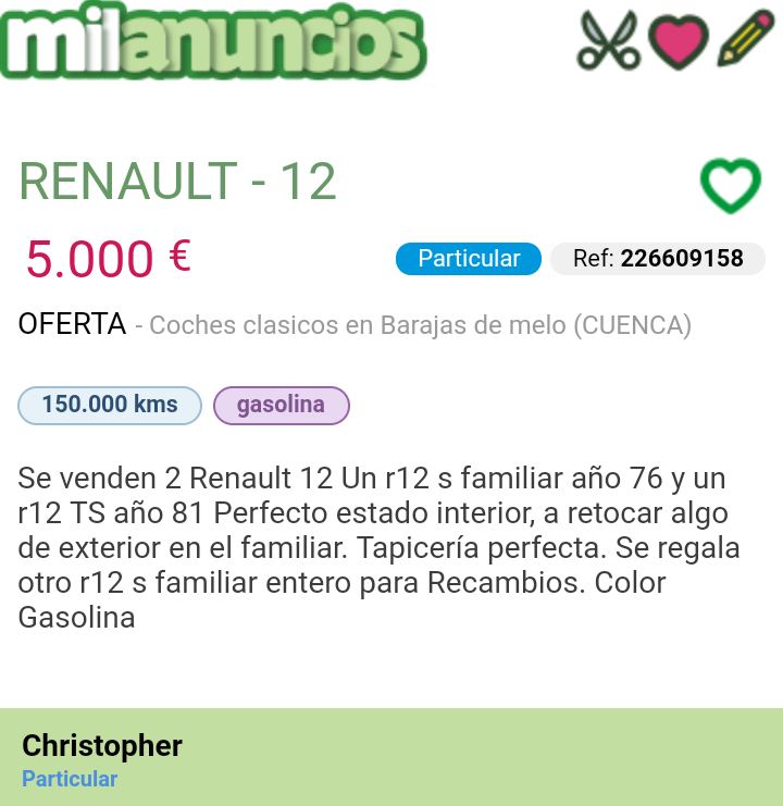 No sé si los moverá mucho o poco, pero el S familiar es bastante conocido por el estado impecable (al menos por las fotos) en el que se vendió en su momento a este dueño, y ha sido utilizado para ilustrar las fotos en Pieldetoro del reportaje del R12 S familiar de una revista antigua.