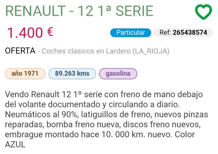 Al final...esos pilotos apenas los ves...y tienes un N en toda regla cuando vas conduciendo.Vin Diesel escribió: ↑01 Ene 2019 23:59Eso es reversible y aunque se ve claramente que es un coche para repasar entero, si el dueño está dispuesto a negociar el precio, yo creo que es un 12 la mar de interesante para meterle mano y tener un coche elegante luego de restaurarle.