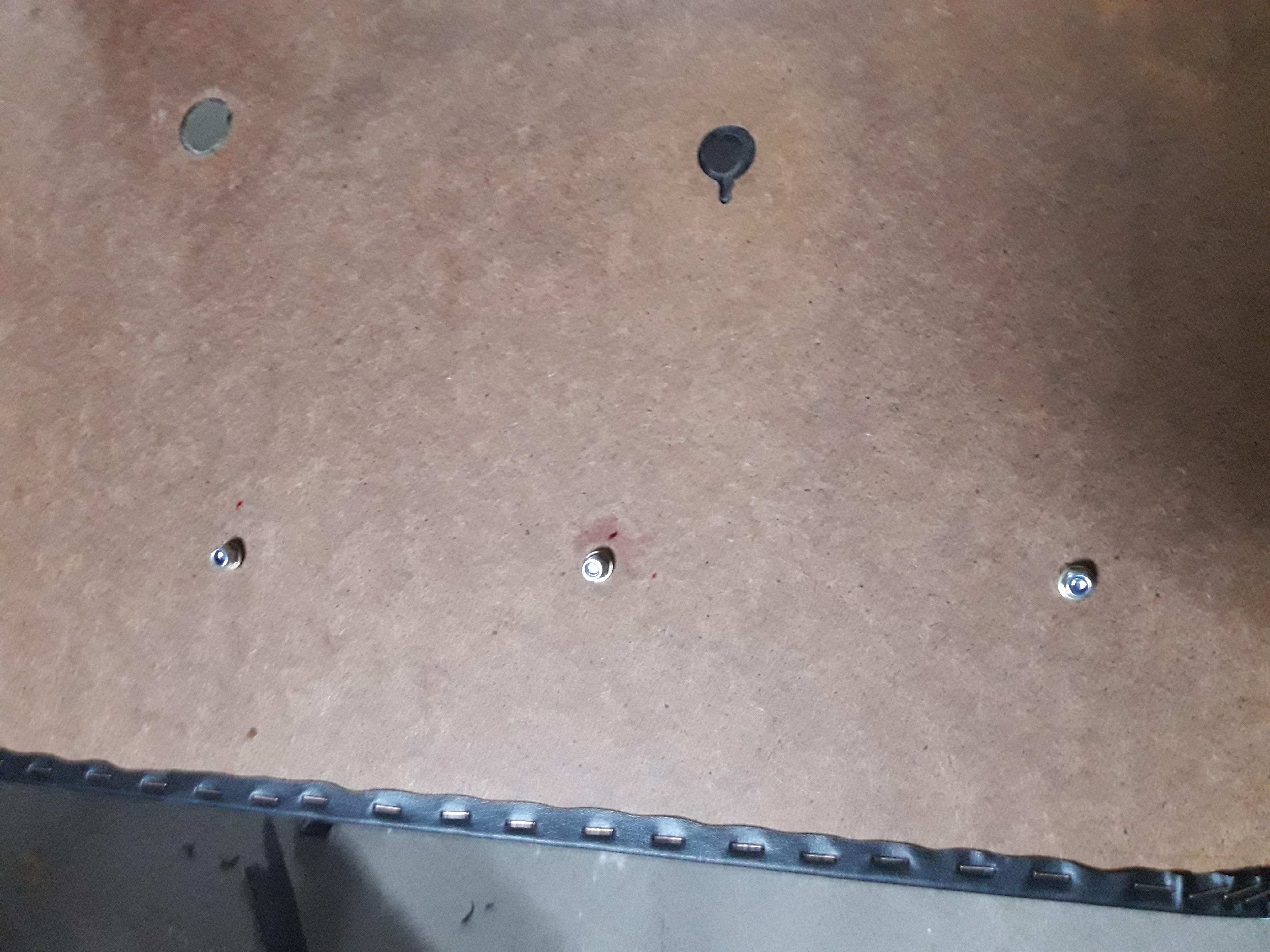 En los de debajo, las tuercas que van por el interior van a pegar en la chapa de la puerta, asi que hay que marcar el sitio donde tocan y hacer un agujero para que las tuercas se cuelen dentro y el revestimiento quede a paño de la chapa.