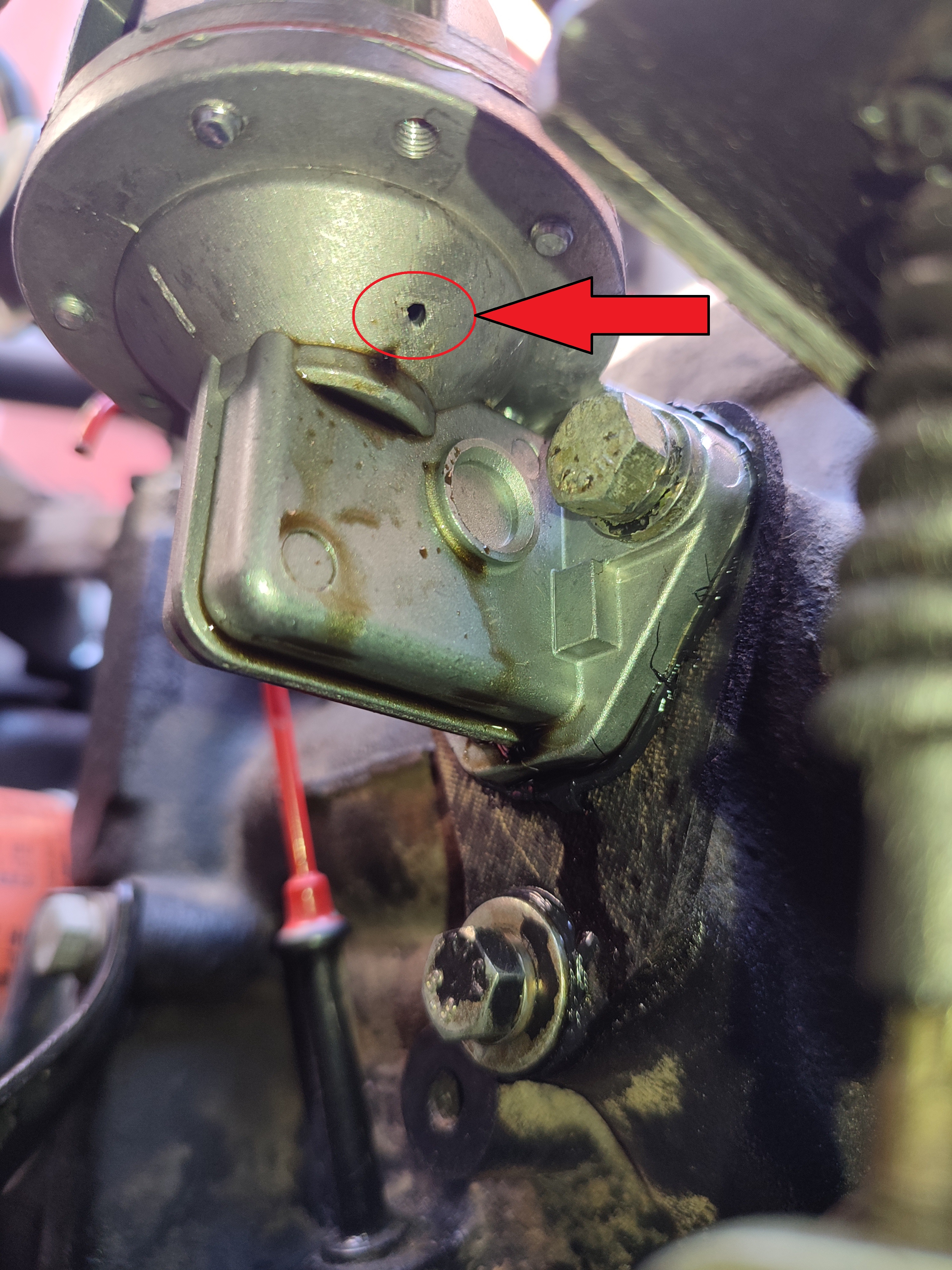 Creo que el cuerpo inferior de la bomba se llena de aceite que viene del lateral del bloque motor y acaba saliendo por el orificio. Supongo que algo de aceite debe tener, para lubricar el mecanismo, pero quizá llega excesivo aceite.