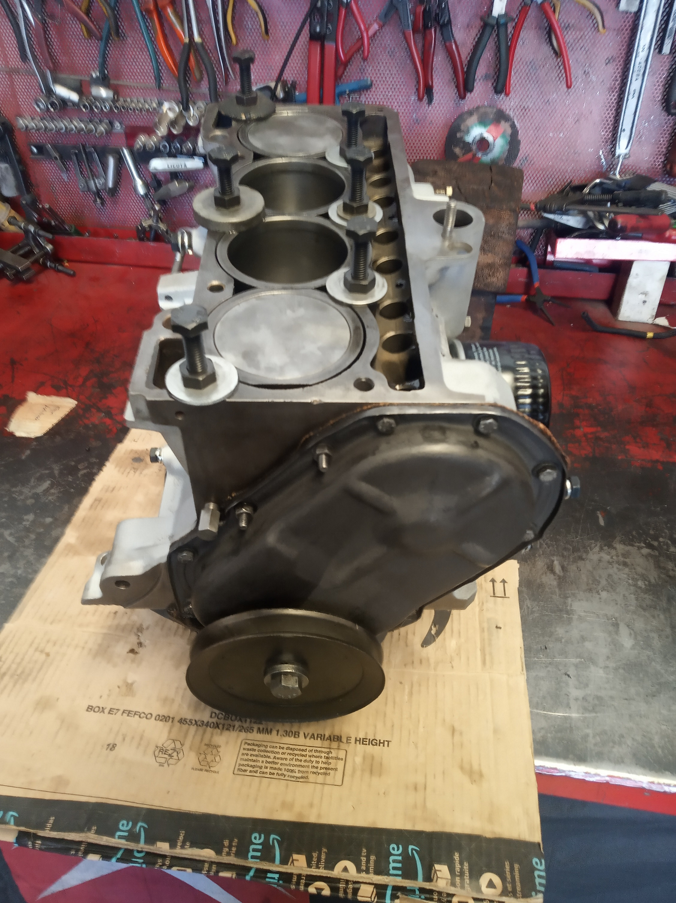 Vuelta al motor otra vez, para ponernos con la culata. Polea puesta, con su reten nuevo por supuesto y tornillo con fijador. POr quitarlo del medio puse el filtro de aceite jjjj me hacia ilusion, lo compre hace un siglo por los menos -grin