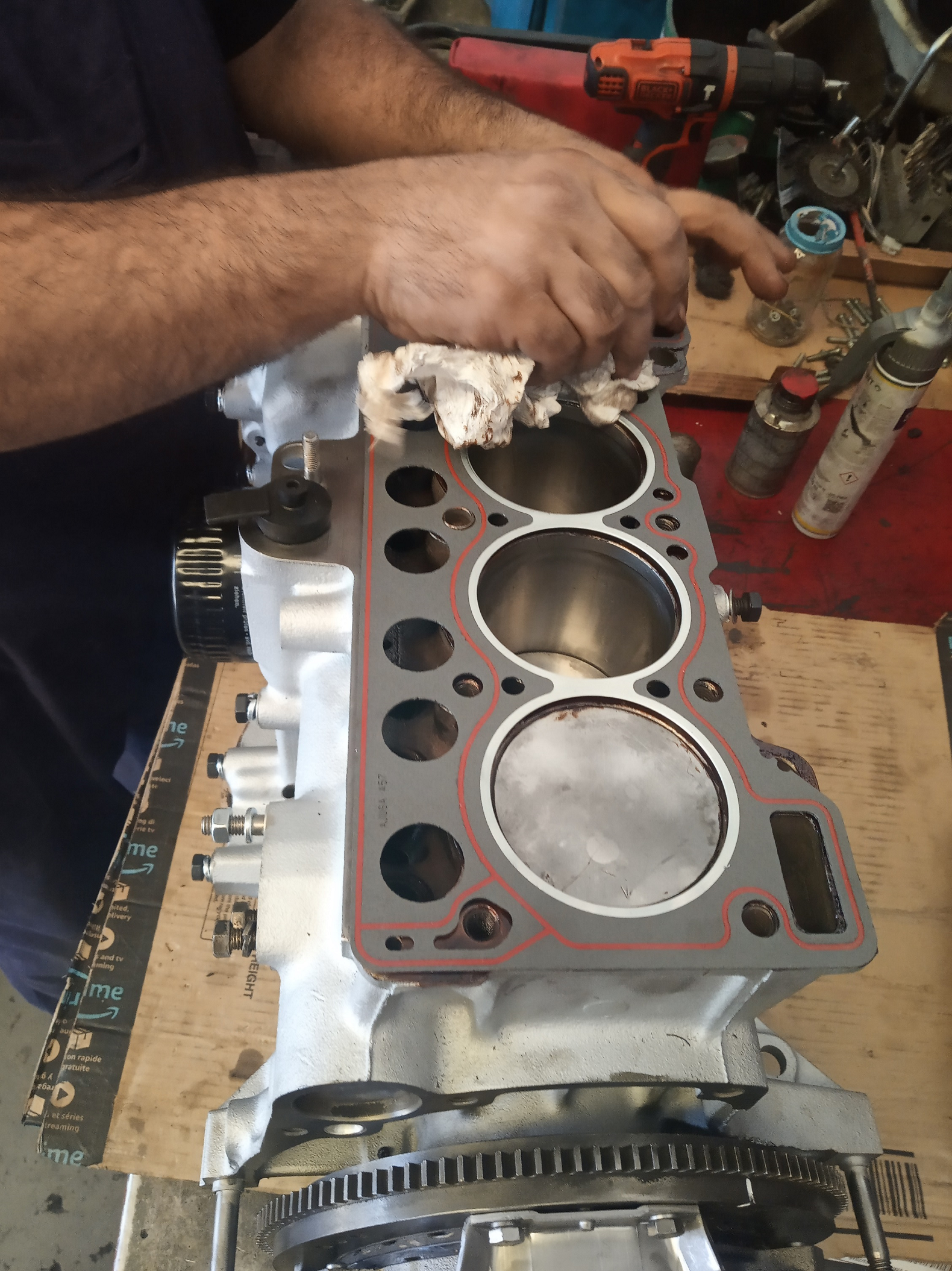Colocando la junta de la culata. Gran momento.