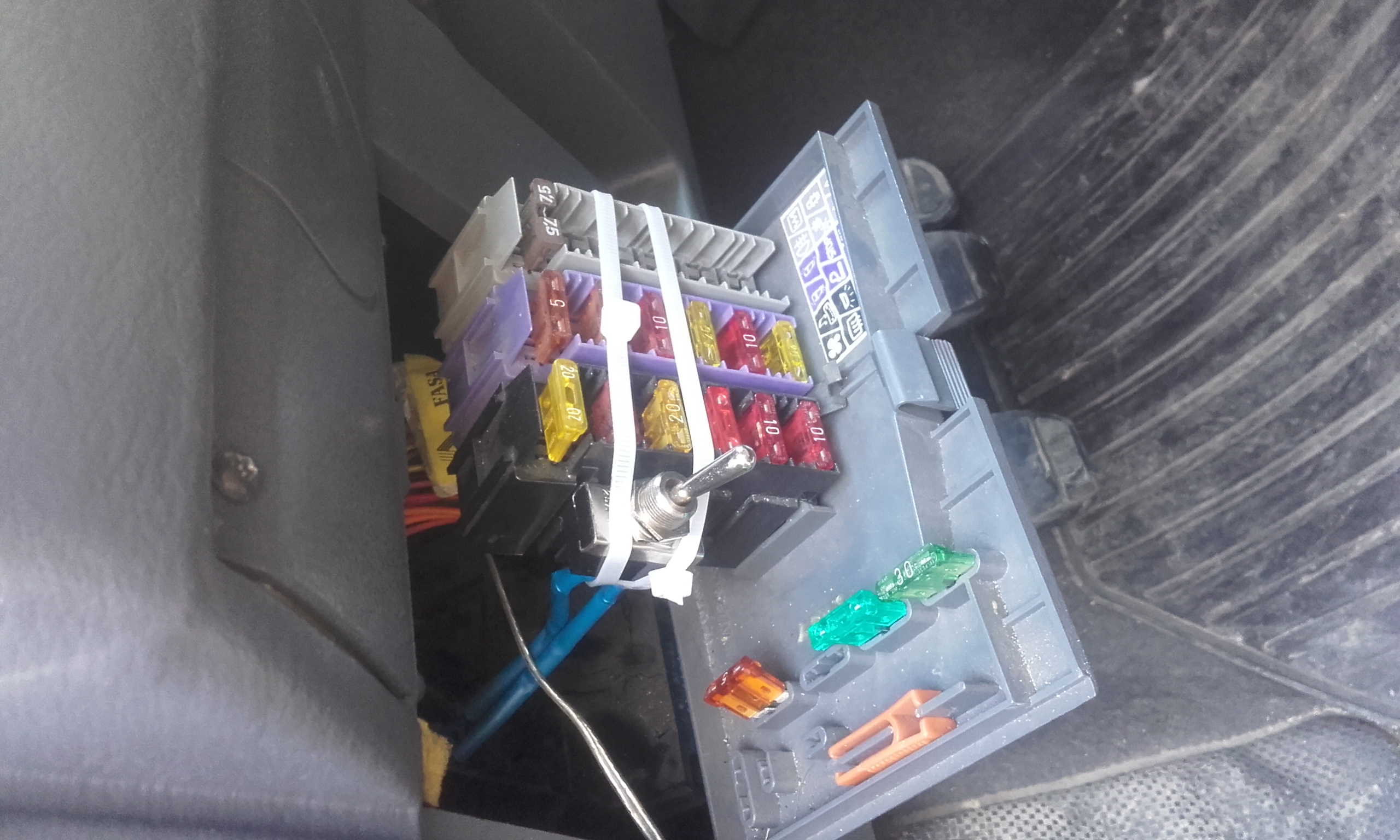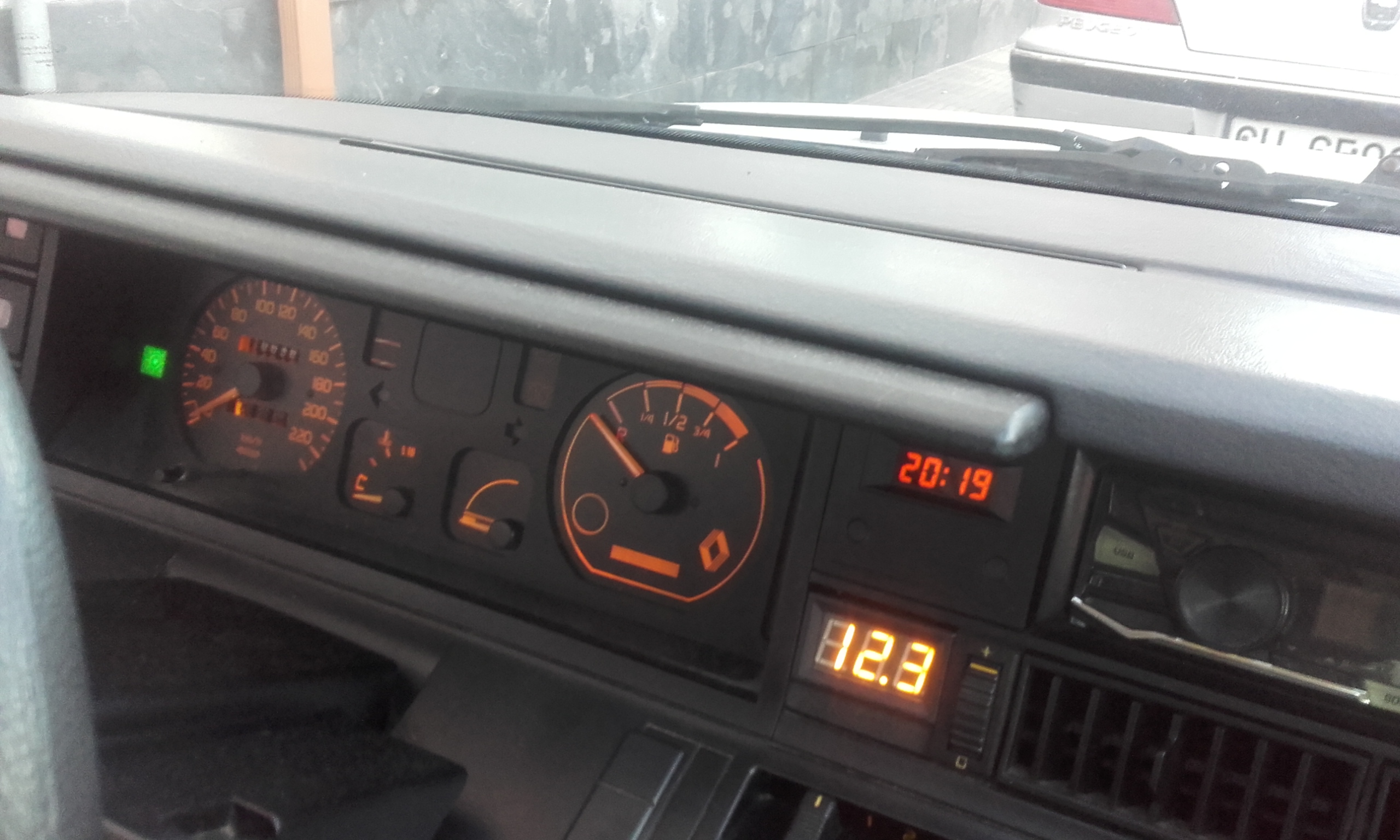 Interruptor para conectar el electroventilador de forma manual, y voltímetro debajo del reloj de hora original.