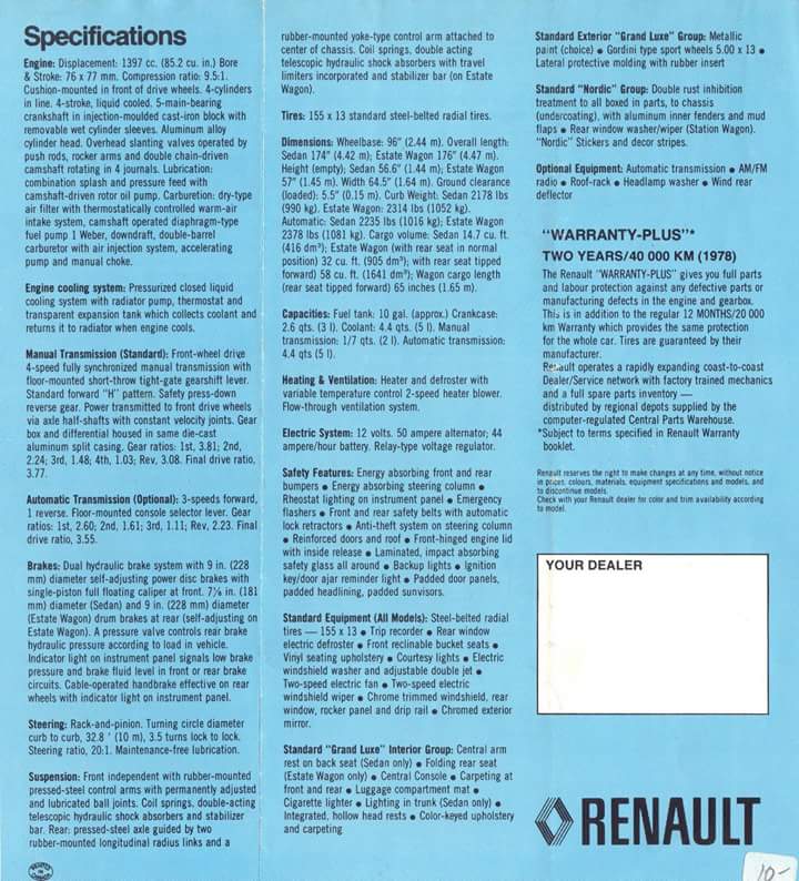Bodies were given aluminum inner fenders—first developed by Renault for its Finnish market, mud flaps and special Double Rust Inhibition--an anti-corrosion treatment— employed in boxed in areas under the chassis. An electric rear window heater-defroster was made standard equipment. A rear window washer-wiper was given to the station wagon. All Renault 12 Nordics carried the Regie’s two-year/40,000-kilometre warranty that covered the entire car for the first 12 months or 20,000 kilometres and then labour and parts for drivetrain defects the second year.