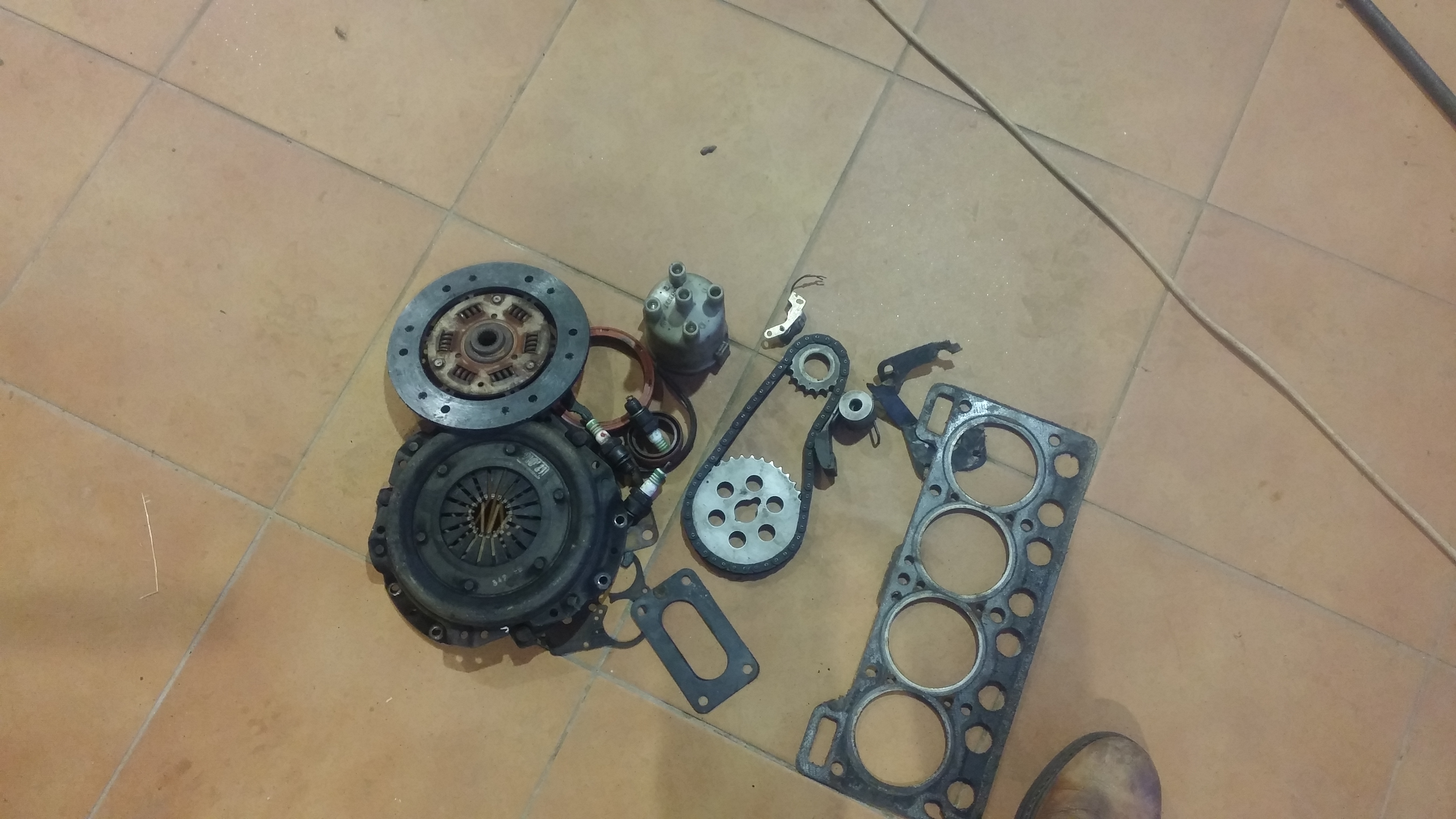 Empezamos sacando el conjunto motor-caja de cambios. Seguidamente le dimos un buen repaso, se sustituyeron juntas, retenes, bujías, platinos, embrague, kit de distribución... La cadena de distribución estaba un pelin estirada y no coincidían las marcas de calado debidamente por eso decidi sustituirla Disculpad la calidad de las fotos, como dije perdí un montón de fotos debido a un problema con el disco duro del ordenador estas son las únicas que me quedan en el móvil.