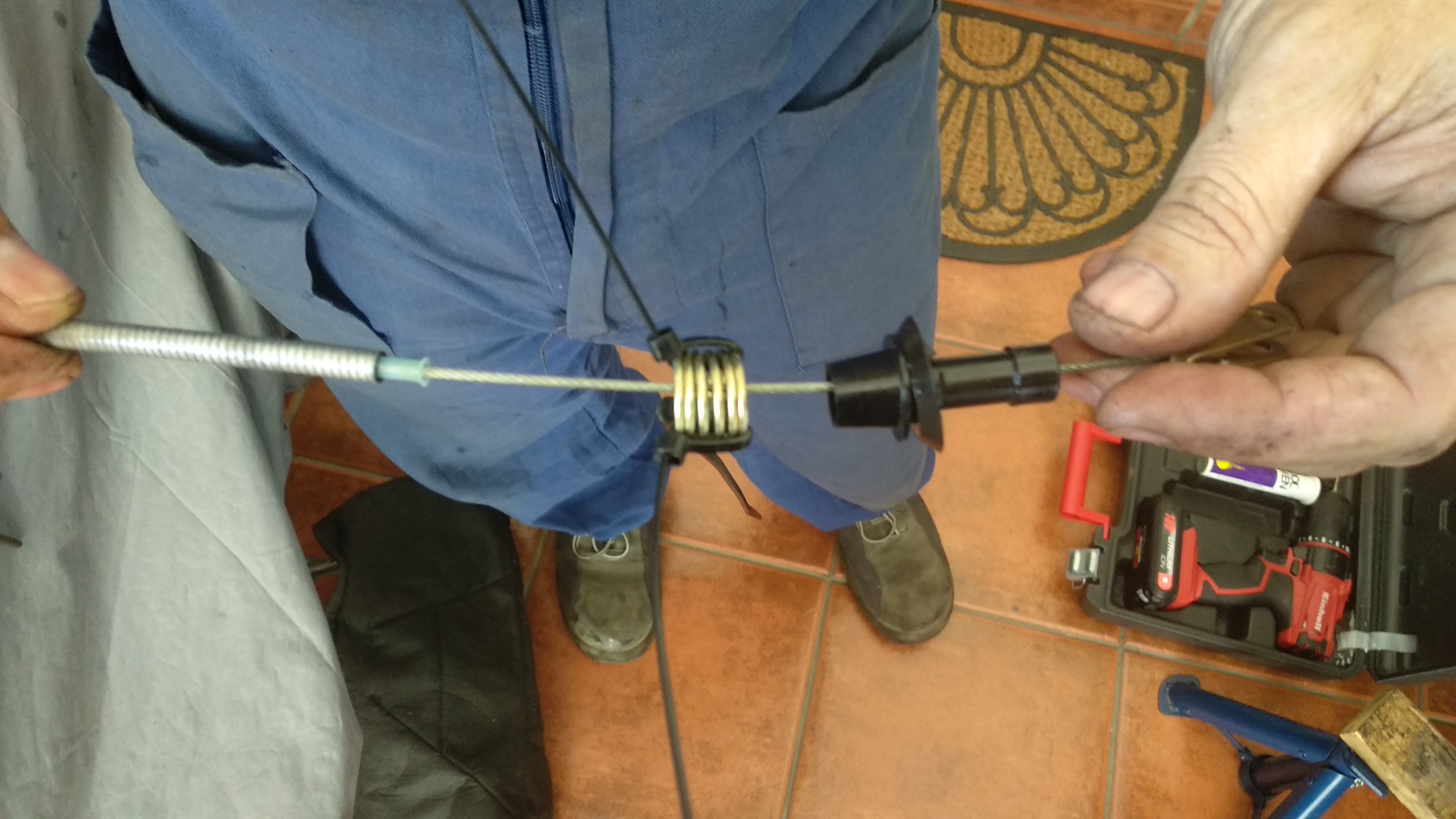 Nos encontramos con la dificultad de montar el nuevo prensando el muelle a mano pero pronto se nos ocurrio la idea de prensarlo con bridas y luego retirarlas. El muelle tiene tanta fuerza que una ves instalado y cortadas las bridas ha sido imposible retirar las bridas asi que iran pisadas por le muelle hasta nueva rotura, que espero que ocurra dentro de mucho tiempo.