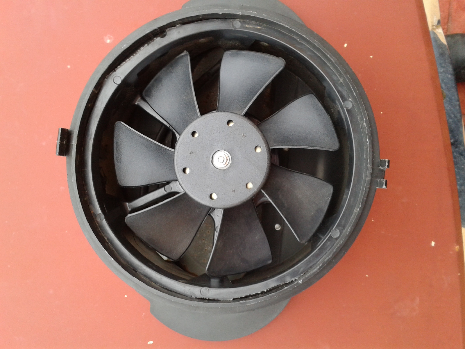 Primera fase de acople, acabada, parece como el original, con la diferencia de que las aspas del sustituto moderno son de plástico, en lugar de las antiguas de chapa (más peso y con mayor inercia). La potencia del motorcillo es de unos 40W, consume 3 amperios, son datos técnicos que no aparecen en ningún sitio a la hora de buscar y pedir. Los electroventiladores habituales de mercado que se suelen vender para radiador de motor son más potentes (entre 80 y 160 W) con lo cual si se monta uno de esos es muy probable que haya un caudal de aire tan grande que no dé tiempo a calentarse el aire que pasa al habitáculo. Por ello indagué sobre los de moto y quad, ATV.