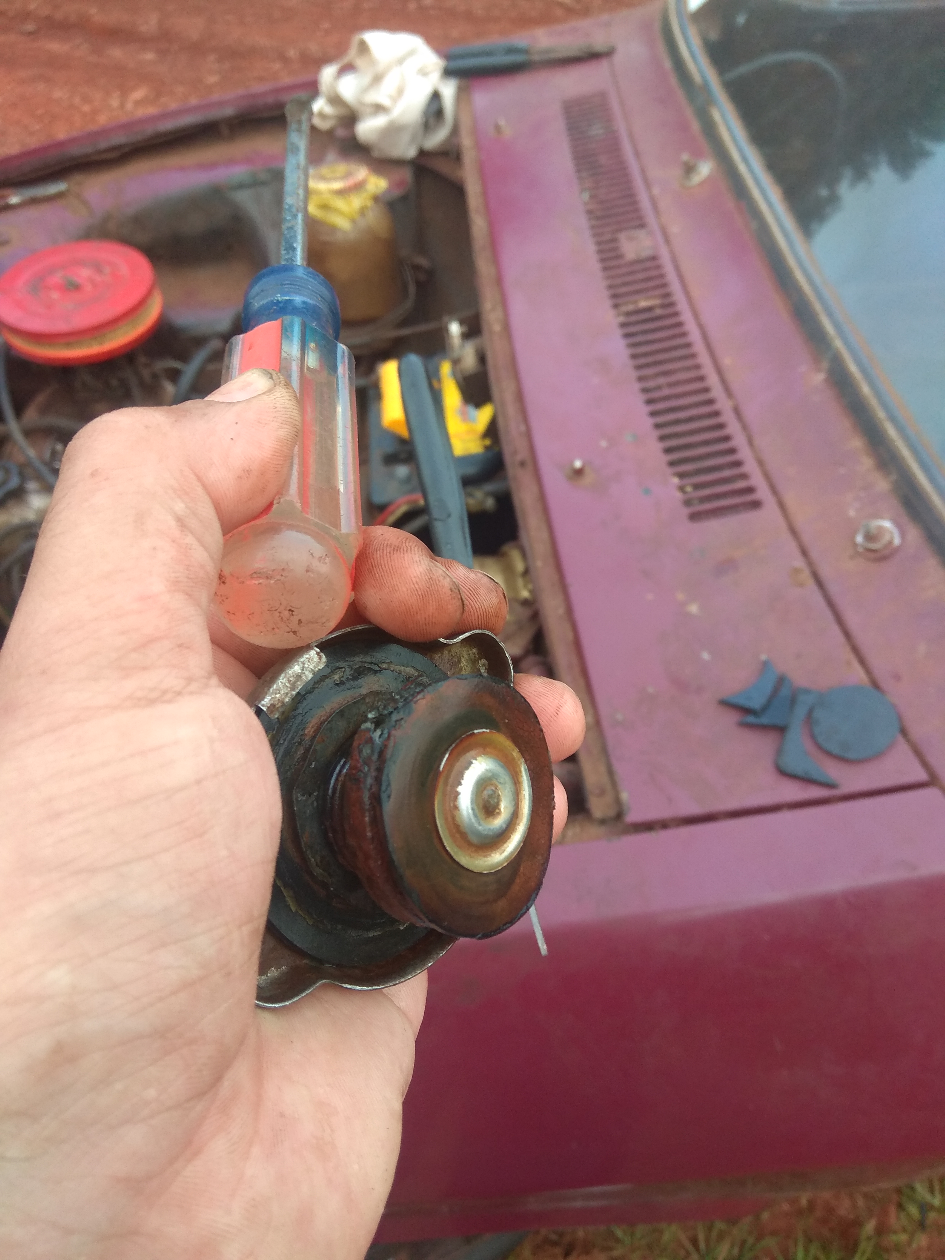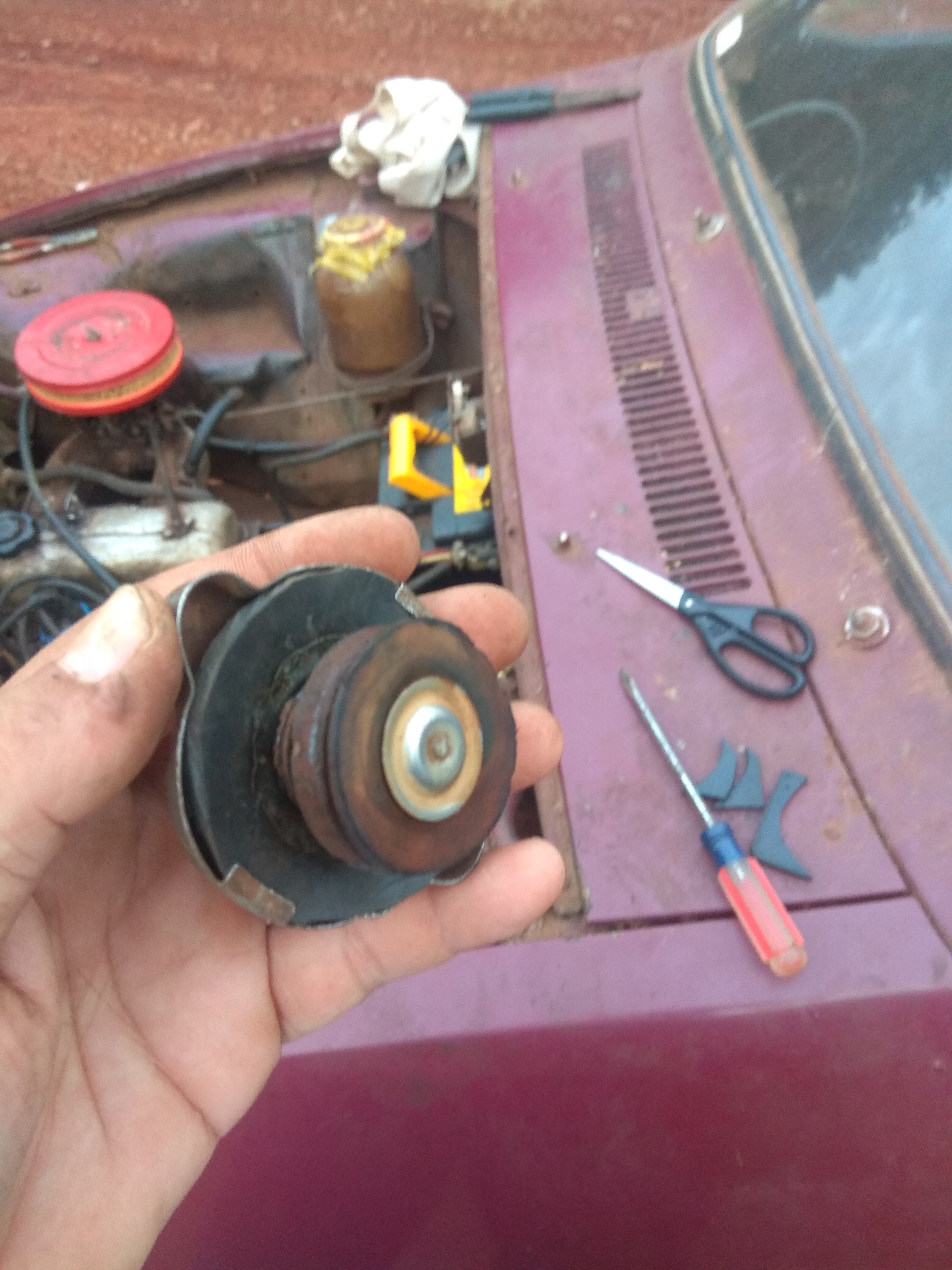 Me preocupo y abro la tapa del radiador, me costó muchísimo, debe llevar 20 años sin abrirse, debo cambiarla, esta destruida.. El agua esta algo turbia, pero no hay mayonesa..